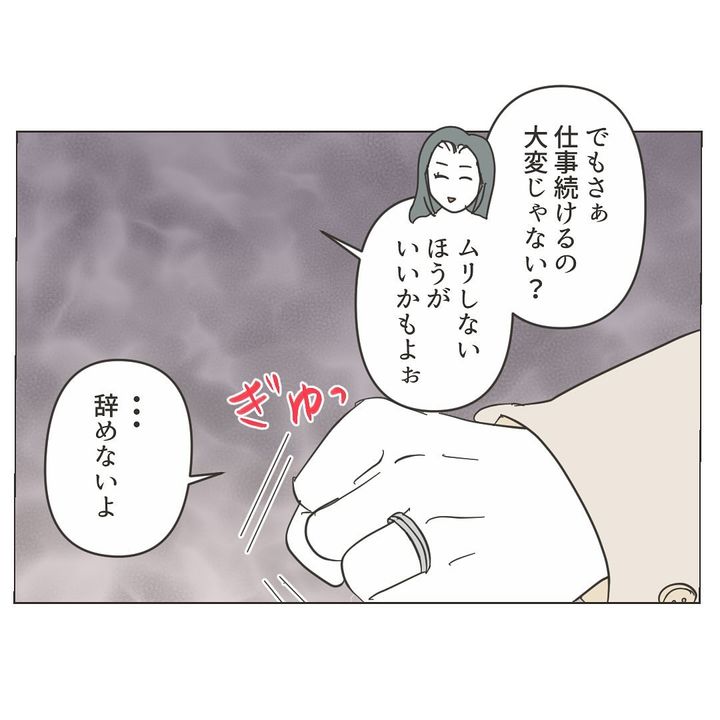 同僚に妬みを買ってしまったのか「出産後は仕事を辞める」との噂を流されてしまったミミさん。誰がそんなことを言いふらしているのか、ミミさんは疑心暗鬼になってしまいました。そこに、同僚のリナさんが「仕事続けるの大変じゃない?ムリしないほうがいいかもよぉ」と、少し嫌みな言い方…。ミミさんはぎゅっと手を握りしめ、「仕事は続けるから」と宣戦布告するのでした…!