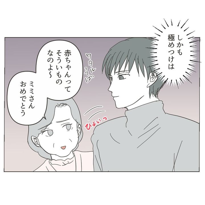 生まれたての子どもを見て「サルみたいだね」と言い放った夫さん。「ありがとう」や「お疲れ様」といった労いの言葉をかけてくれると思っていたミミさんは、夫さんの反応にがっかりしてしまったようです。しかも、夫さんの後ろにはお義母さんの姿が…。お義母さんの入室を聞いていなかったミミさんは「なんでもうお義母さんいるの!?」と、ショックを受けるのでした。