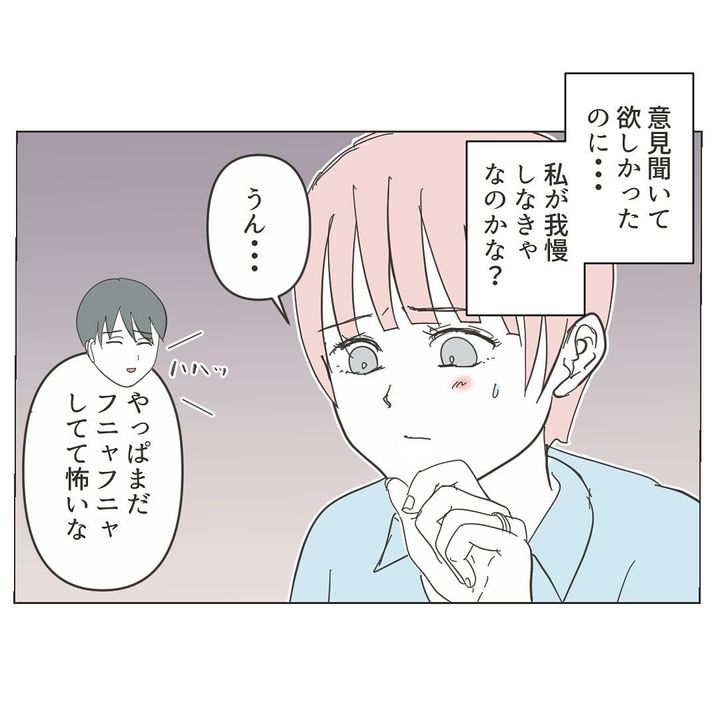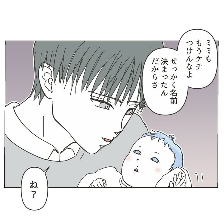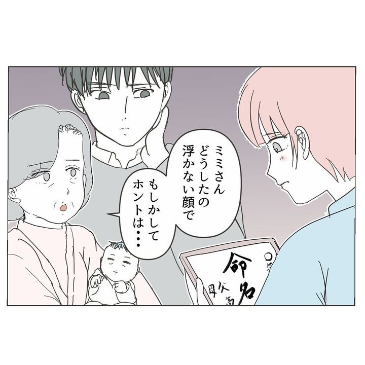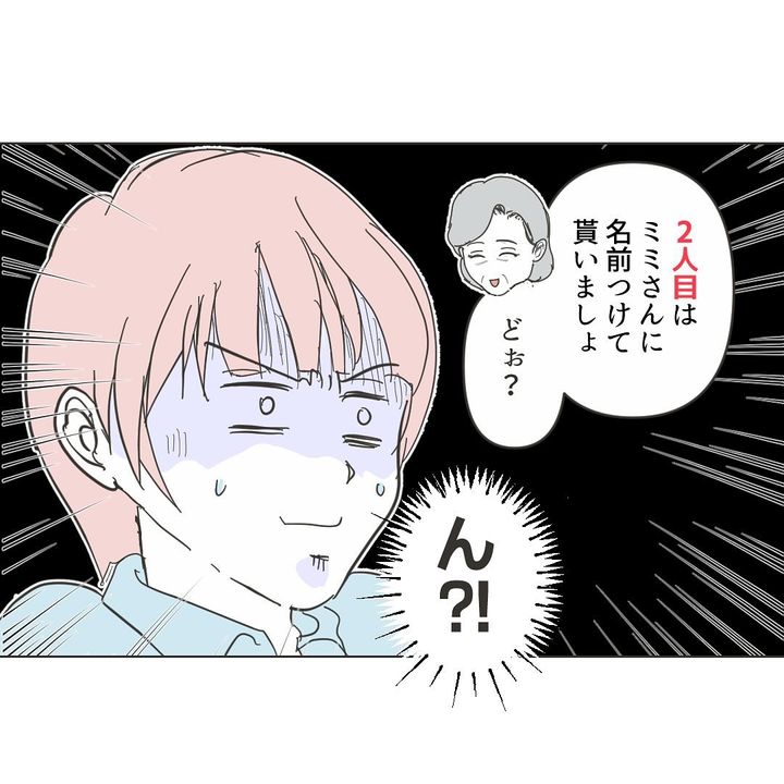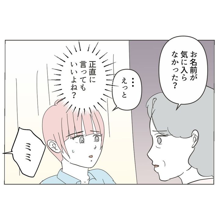 自分で子どもの名付けをしたいとお義母さんに伝えると、お義母さんは気持ちを理解してくれた様子。ミミさんは「(子どもの名付けに)まだ間に合うの?」と期待しますが、すでに出生届を出したとのことで、「2人目はミミさんに名前をつけてもらいましょ」と提案されて終わり…。夫さんからも「もうケチつけんなよ」と言われ、ミミさんは気持ちをぐっと押し殺すのでした。