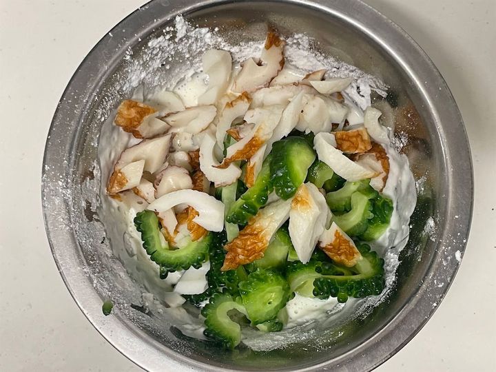 1. ボウルに[A]を入れ混ぜ合わせてから、ちくわとゴーヤを入れ、混ぜ合わせます。
