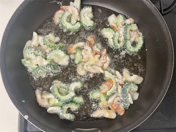 ちくわとゴーヤは分離しやすいので、油の中に入れたら揚がるまで触りすぎないようにしてくださいね。