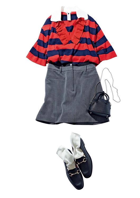 ボーダーポロニット¥31,900/ダブルスタンダードクロージング(フィルム) ミニスカート¥17,600/アルページュストーリー バッグ¥1,990/神戸レタス 靴下¥990/靴下屋(タビオ) ローファー¥25,300/銀座かねまつ(銀座かねまつ6丁目本店)