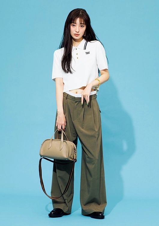 ポロニット¥7,920/31 Sons de mode(ヒロタ) パンツ¥7,920/CITEN(ユナイテッドアローズ) ピアス¥2,980/ヘンカ(ロードス) ブレスレット¥7,700/ロニ バッグ¥19,800/ドレステリア(ドレステリア 渋谷スクランブルスクエア店) ローファー¥19,800/ダイアナ(ダイアナ 銀座本店)