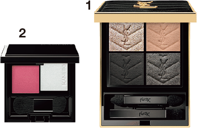 クチュール ミニ クラッチ 700¥10,890(イヴ・サンローラン・ボーテ)2 頰の高いところへ横長の楕円状にピンク→ホワイトの順で重ねる。カネボウムードブースティングブラッシュ 04¥5,830※セット価格(カネボウインターナショナルDiv.)