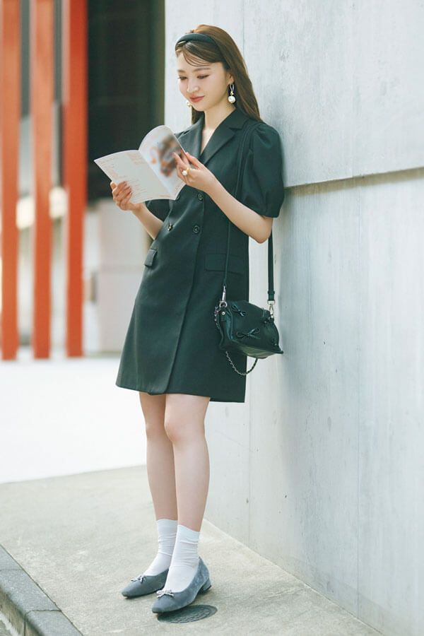 ソックス+リボン付きシューズのグッドガールテイストな足元で、黒のミニ丈ワンピを鮮度よく着こなして。