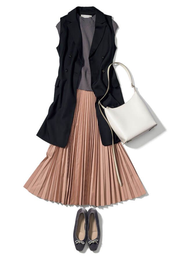 ジレとプリーツの縦ラインで細見せを狙って♡