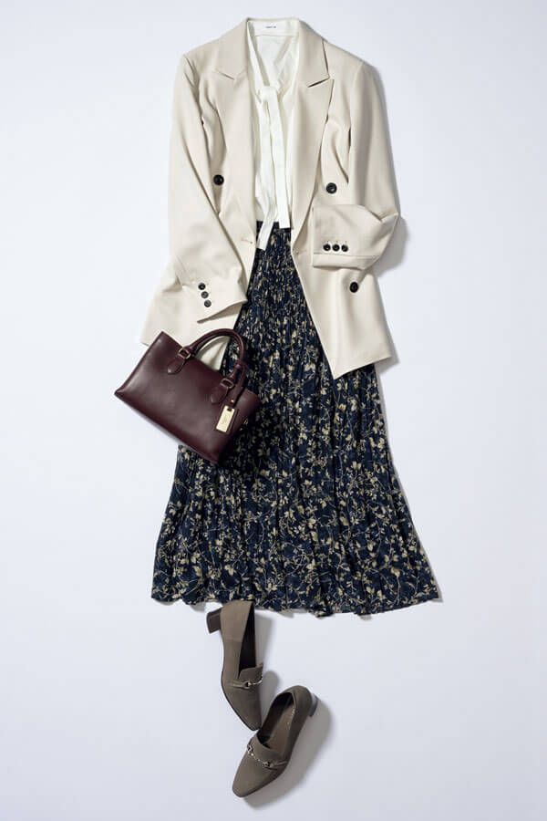華やかさがありながら、落ち着いた印象を与え る花柄のプリーツスカート。ジャケット&シャツのまじめ合わせも一気にフェミニンなコーデへ。