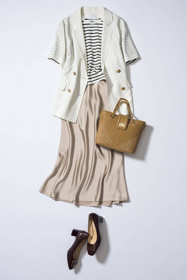 シャイニーな艶めきを放つサテンスカートで、 お仕事コーデに旬のムードをプラス。動くたびに揺れるマーメイドシルエットも、女っぽさを後押しします。
