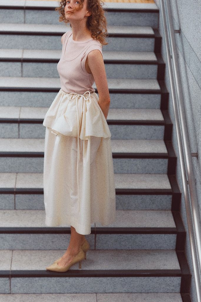 サイドのリボンを結ぶとウエストからふんわりと広がる、シルク混のタフタ素材。相棒にはタンクのようにミニマルだけどさっぱりしすぎない、レイヤード風のデザインTシャツをセレクト。くすんだピンクの穏やかな色みが、スカートのドレッシーさをうまく中和。