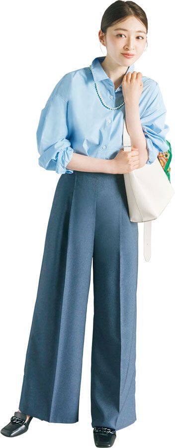 シャツにワイドパンツ、足元はローファーパンプスで知的なマニッシュに。首元にパールでひとさじの甘さを盛って洗練を。