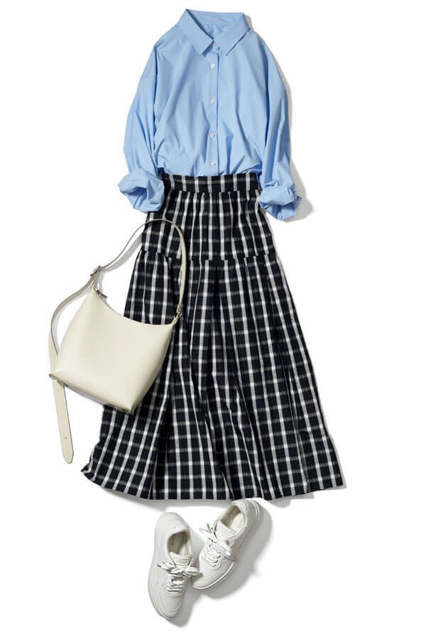 プレーンなシャツにモノトーンのチェック柄スカートを合わせて、お嬢様風情な上品コーデに。清潔感ある白レザーのスニーカーが、ラフに転びすぎない絶妙なハズしに♪