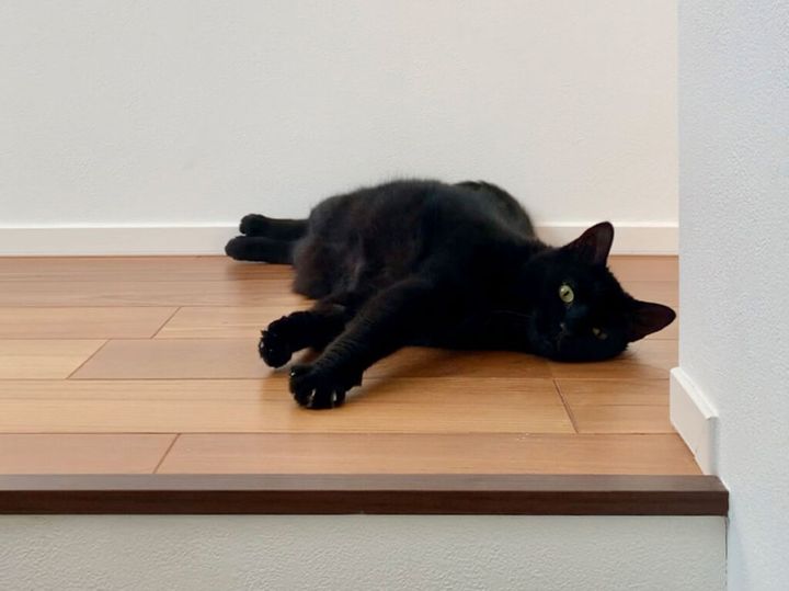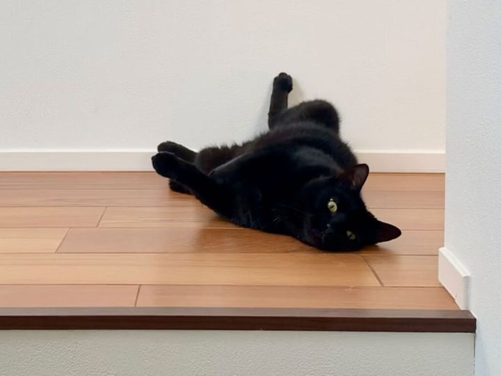 飼い主さんが階段をのぼって来たので、起きようかと思いながら……、