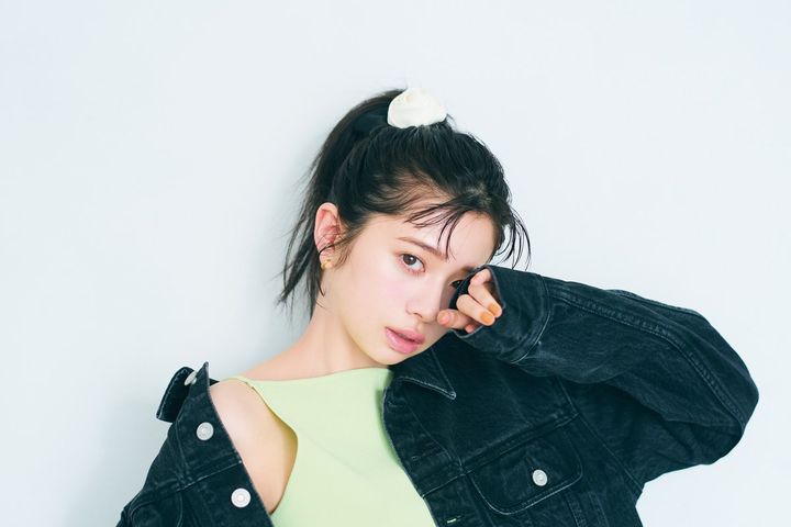 桜田ひより。ar9月号より シュシュ¥3,850/ユー バイ スピック&スパン(ユー バイ スピック&スパン ルミネ池袋店) ジャケット¥17,380、キャミソール¥6,600/マウジー(バロックジャパンリミテッド) イヤリング¥4,180/mimi33(サンポークリエイト)