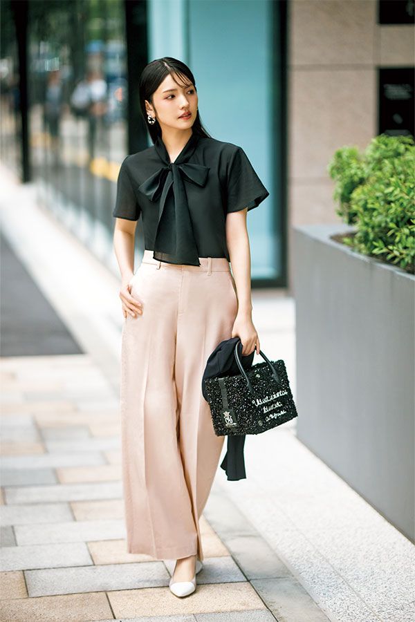 黒地ならボウタイが大人顔に。パンツは美脚見えを狙えるセンタープレス入り♪