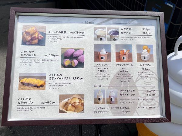 そして、入り口から少し離れたところにメニュー表を発見。 約10種類のお芋スイーツやドリンクがあり、お値段も300円〜と魅力的です!ラインナップを見てワクワクが止まりません。