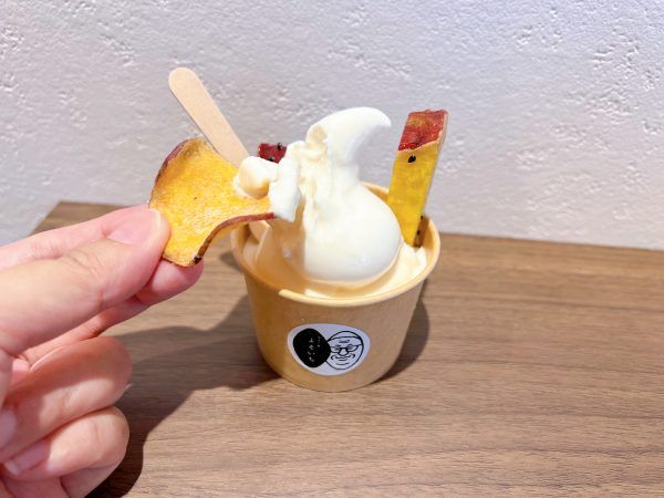 こちらは「お芋ソフトクリーム」です。先ほどの「よそいちのお芋チップス」や「よそいちの蜜芋 200g(780円)」がトッピングされています。 濃厚なミルク味のソフトクリームに、甘さと塩気のあるお芋チップスがマッチします。蜜芋は蜜の甘さと黒ごまの風味がきいており、こちらもお芋チップス同様ソフトクリームと一緒に美味しくいただきました。