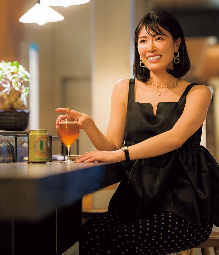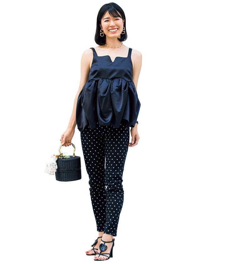 『普段出かける場所とは違うエリアに足を伸ばして新規開拓したり、ドラマティックな空間で夫婦時間を共有するのが好き。ブラックのキャミビスチェは、腰回りのボリュームが立体的でチューリップのような可憐さと華やかさに一目惚れ。ドット柄のパンツと好相性です。』