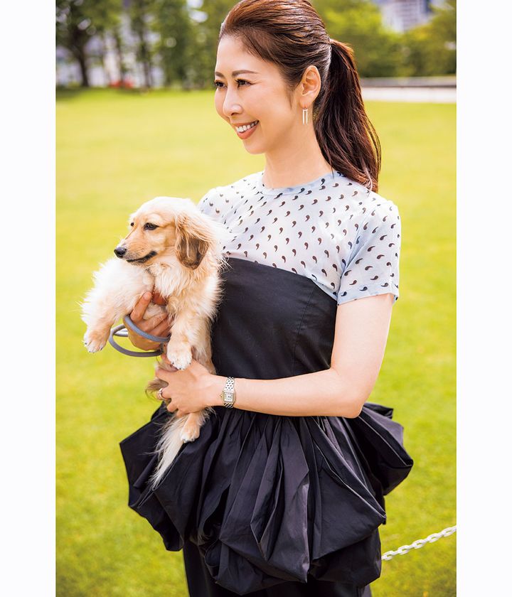 『シアーTシャツは、重くなりがちな黒パンツに抜け感をくれます。女っぽいペプラムビスチェでバランスを取って、愛犬とのお出かけコーデが完成。』