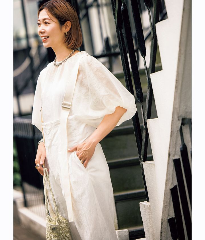『上品な透け感に一目惚れ。複数の店舗を巡りたいので、気の赴くまま軽快に歩けるサロペットを合わせて。子連れではできないオールホワイトもポイント。』
