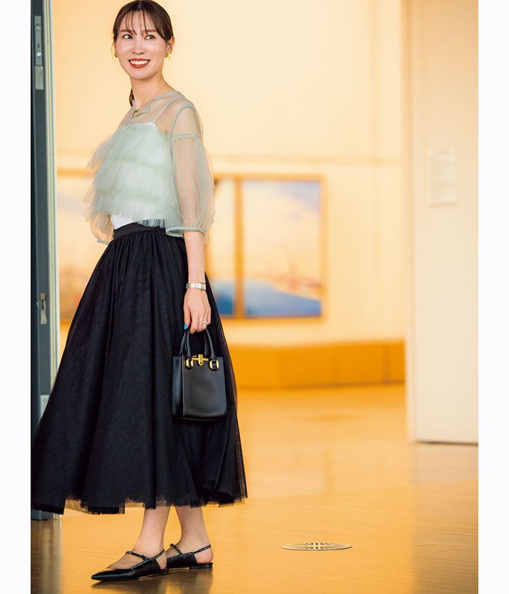 『夜にアートに浸るという時間空間に合わせて上下チュール合わせのドラマティックなシルエットに。靴の音が気にならないようフラットシューズがベスト。』