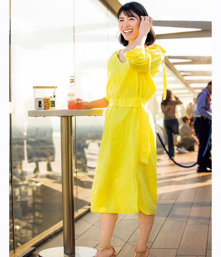 『夏らしいイエローでHappyな気持ちになるオフショルワンピは、ショルダーリボンがお気に入り。ゴールドサンダルもワンピとの馴染みが抜群です。』