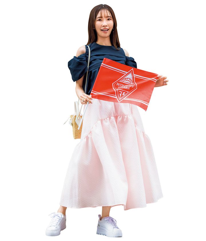 『腕が動かしやすいトップスは二の腕カバーができるのもポイント。ピンクスカートで甘さも残すのが私流。足元は歩きやすさ重視でがっつり応援します。』