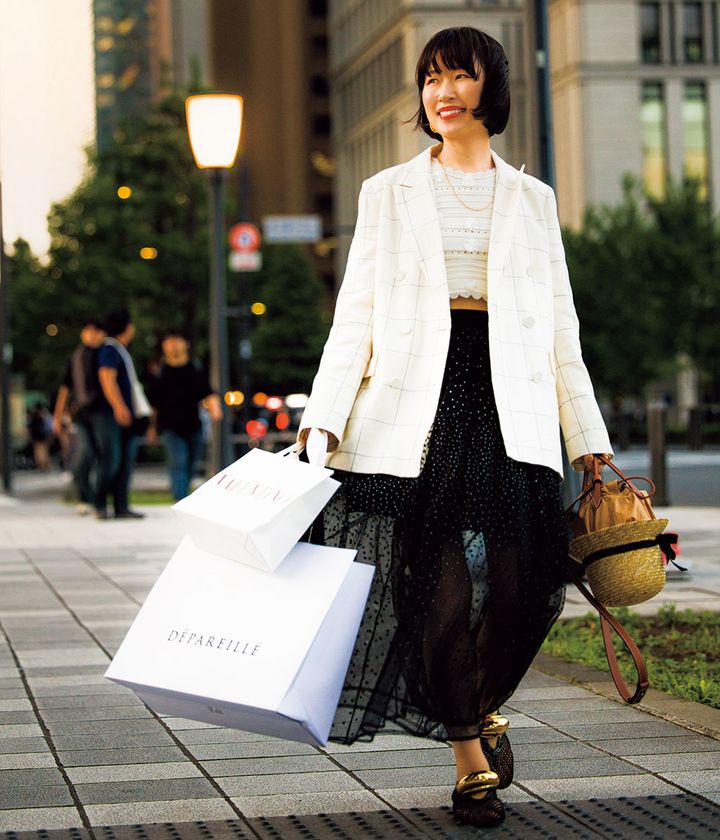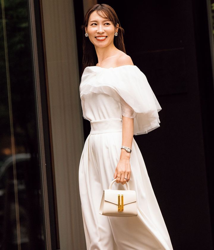『行きたい場所、一緒に行く人の雰囲気に合わせて、ワクワク気分を盛り上げてくれるコーデを考えるのも楽しみの一つ。ホテルは非日常を楽しめるから、思い切って肩を出すチュールオフショルを、白ワントーンでまとめて。上品に女らしく、ゆったりホカンスを満喫したい。』