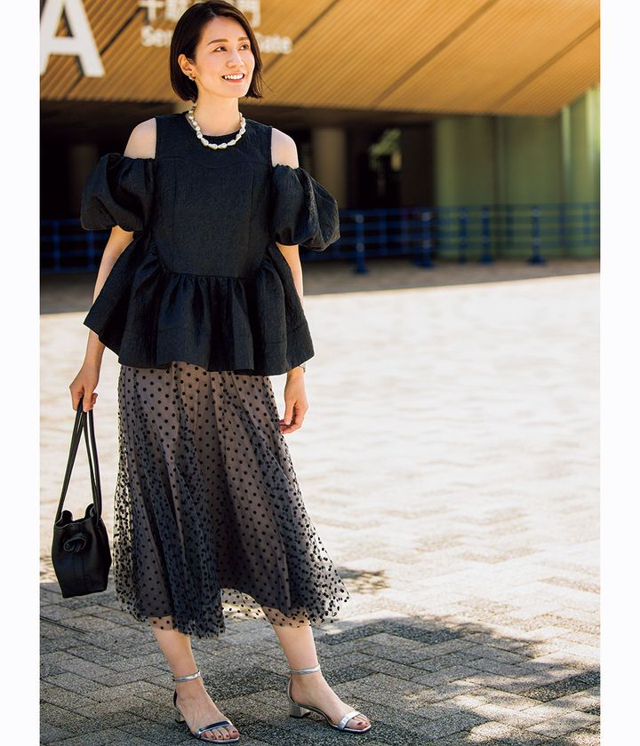 『ボリュームトップスと透け素材の構築的なスカートで、女っぽくキレイめなコーデに。甘くなりすぎないようにパンプスでモード感をプラスします。』