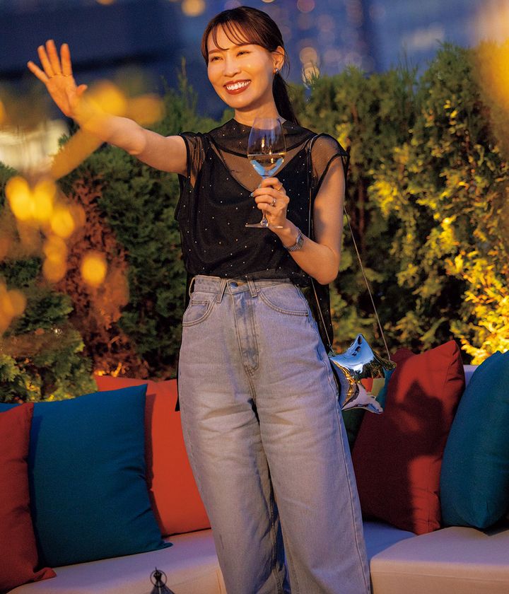 『The Roofのテラス席なので、ラインストーンがきらめいてテンションがあがるトップスに。待ちに待った夜遊びだからワクワク感をさらに加速させます。』