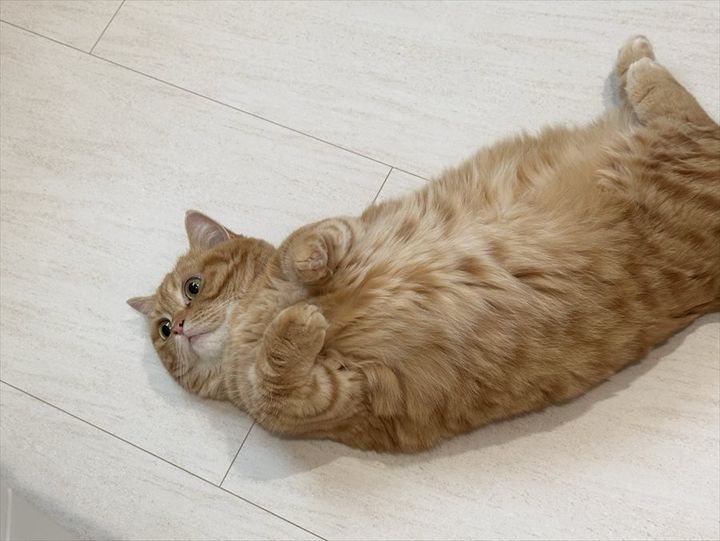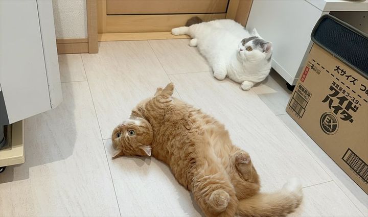 ・へそ天で監督するなんて。ドラムくんを受け入れてるね。