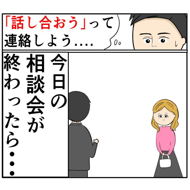 会社を出た良し男さんは、実家に帰ってしまったすみれさんに「話し合おう」と連絡をしようと思っていましたが、それは今日のふり子さんとの相談会が終わった後で、と考えていました。