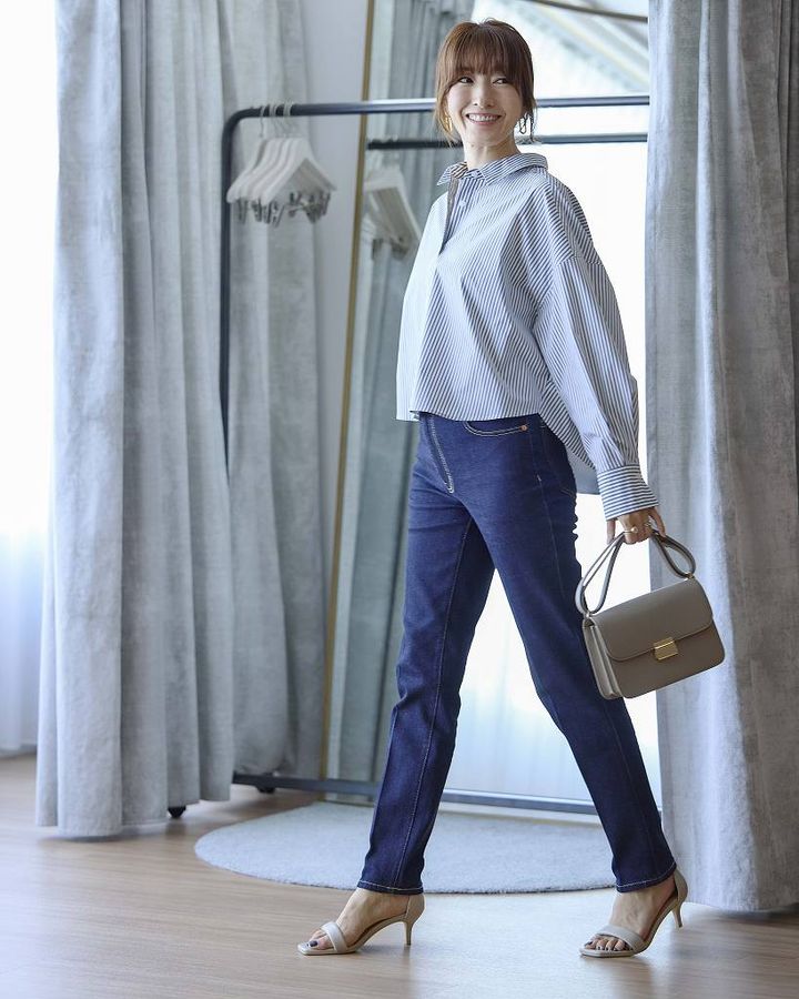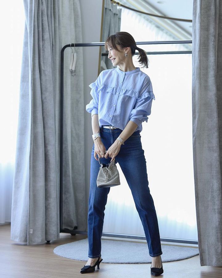 美脚パンツで有名なプラステの中でも特にファンが多いのがスティックパンツ。こちらのPLUS STYLEジーンズシリーズのスティック型もラインの美しさはさすがの一言!通常丈は7サイズ、トールさん向けの丈長めでも5サイズものラインナップなので、自分にぴったりの1本が見つかります。ブルーのジーンズに水色のシアーなブラウスを合わせて軽やかなカジュアルコーデに。