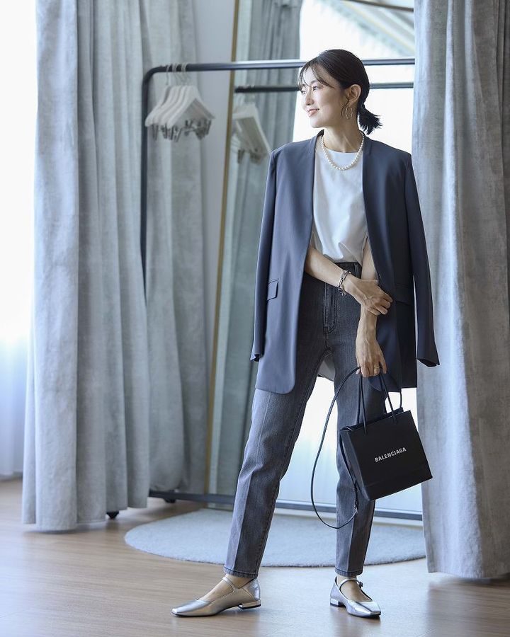 細い見ためとは裏腹に、締め付けられる感じもなく、穿いた瞬間に着心地の良さを実感!前後にセンタープレスも入っているので美脚効果も絶大です!ちょうど、くるぶしが隠れる丈なのでフラットシューズとの相性も◎。きれいめにデニムを穿きたい人におすすめです。オーバーサイズのジャケットと合わせてハンサムにコーディネートしました。
