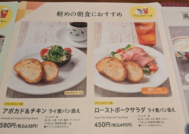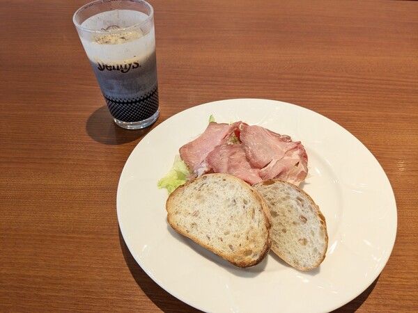 今回は、軽めの朝食におすすめから「ローストポークサラダ ライ麦パン添え」(ドリンクバーつき)を選択。やわらかなローストポークにドレッシングがかけられたシャキシャキのサラダ、香ばしいライ麦パン2個となっています。ドリンクバー付きでなんとワンコイン以下で食べられます。