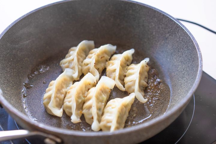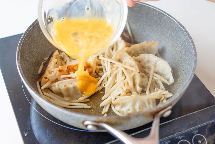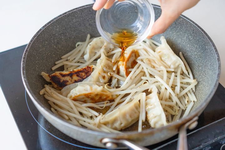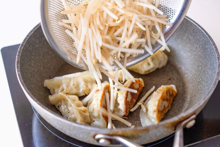 ②餃子が焼けたら、もやしを加えてさっと炒める。