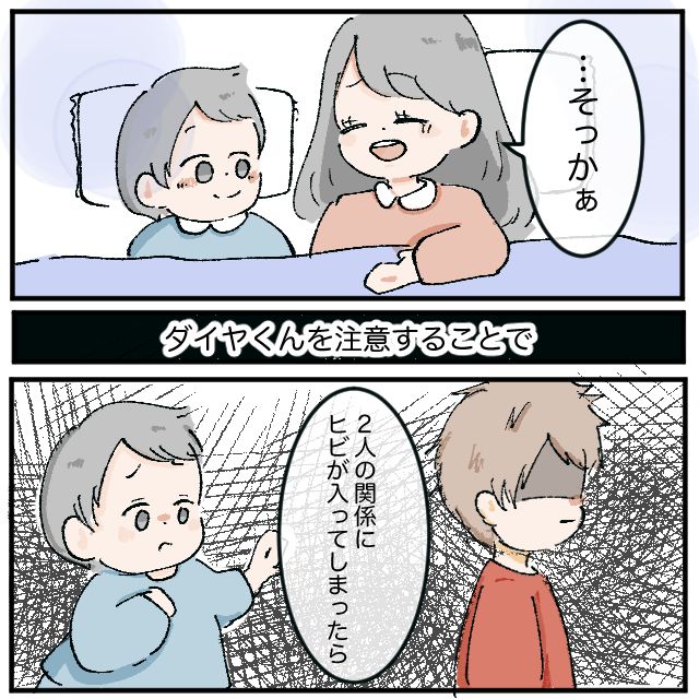 「・・そっかぁ」アサヒくんの笑顔を見たママは「ダイヤくんを注意することで、2人の関係にヒビが入ってしまったら」と心配になりました。