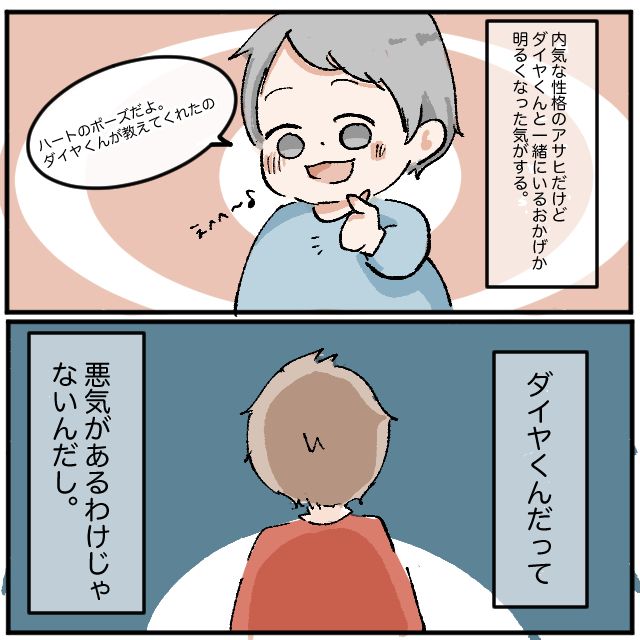 「内気な性格のアサヒだけど、ダイヤくんと一緒にいるおかげか明るくなった気がする」と考えるママ、「ハートのポーズだよ!ダイヤくんが教えてくれたの!」アサヒくんが可愛くポーズを取る姿を思い浮かべました。そして「ダイヤくんだって、悪気があるわけじゃないんだし」ママは自分に言い聞かせるように心の中で呟きました。