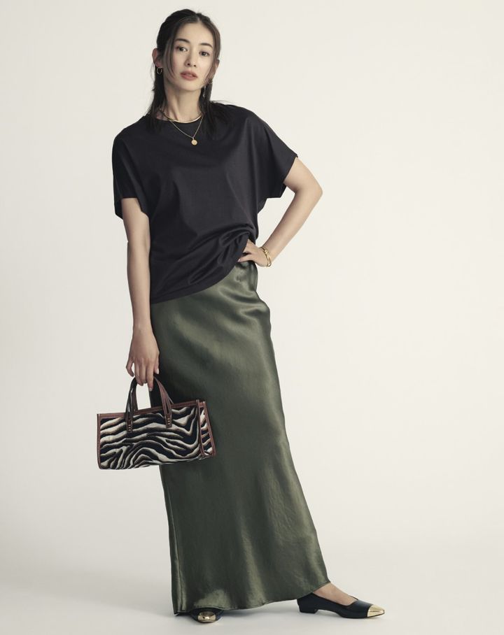 スカート¥29,700(サクラ/インターリブ)Tシャツ¥14,300(エイトン/エイトン青山)バッグ¥51, 700(アヴァケーション/ノーベルバ)パンプス¥59,400(ネブローニ)ピアス¥15,400〈tsugumi iwamoto〉バングル¥78,100〈スキャット〉(ともにロードス)ネックレス¥212,300コインモチーフ¥77,000(ともにウノアエレ)チョーカー¥7,700(loni)