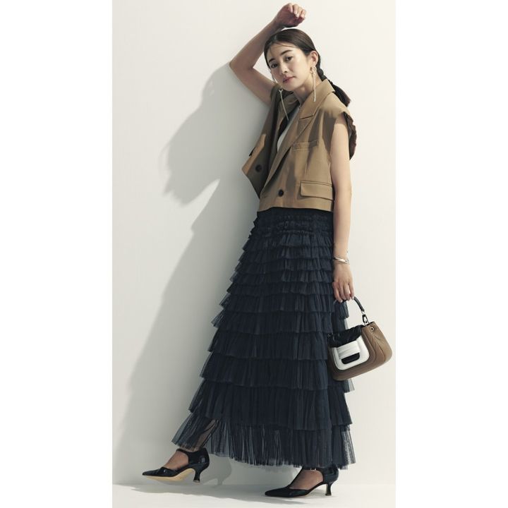 チュールスカート¥57,200(ソブ/フィルム)ジレ¥24,200(メゾンスペシャル/メゾンスペシャル 青山店)タンクトップ¥9,900(セテンス)バッグ¥172,700(ピエール アルディ/ピエール アルディ 東京)パンプス¥49,500(ファビオ ルスコーニ/ファビオ ルスコーニジェイアール名古屋タカシマヤ店)ピアス¥26,400バングル¥57,200(ともにブランイリス/ブランイリス トーキョー)ネックレス[大]¥49,500ネックレス[小]¥17,600(ともにマユ/マユショールーム)