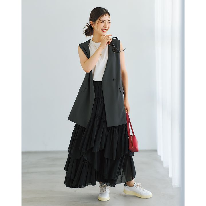 スカート¥36,300(カーサフライン/CASA FLINE表参道本店)カットソー¥8,580(スローン)ジレ¥9,990(アンフィーロ/アンフィーロ〈オンワード樫山〉)バッグ¥30,800(トーヴ/アンソロジー)スニーカー¥33,000(オートリー/ドレステリア 渋谷スクランブルスクエア店)サングラス¥38,500(ブラン/ライト)ピアス¥69,300(ウノアエレ/ウノアエレ ジャパン)ネックレス¥16,500〈cujacu〉リング¥3,740〈KRONOS〉(ともにロードス)