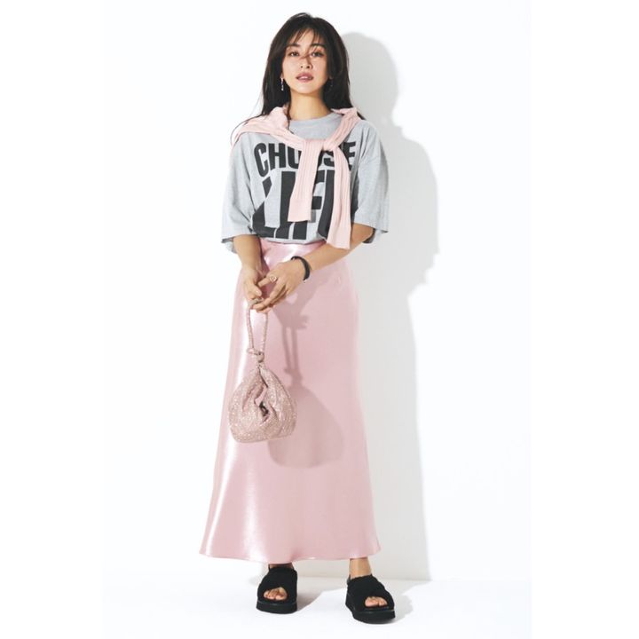 スカート¥16,500(アルページュストーリー オリジナル)Tシャツ¥15,400(THIRD MAGAZINE × mikomori ×KATHARINEHAMNETT/THIRDMAGAZINE)カーディガン¥37,400(スローン/ザ ショップ スローン 新静岡セノバ店)バッグ¥8,690(カシュカシュ/アンビリオン)サンダル¥53,900(サクラ/インターリブ)ピアス¥22,000(マリハ)ブレスレット¥39,600