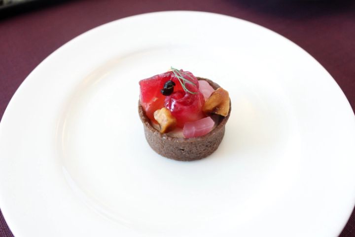 セイボリーでは、長谷さんは「ビーツでマリネしたサーモンタルト」が気に入った様子。「見た目もキレイだし、生の黒コショウが効いています」(長谷さん)