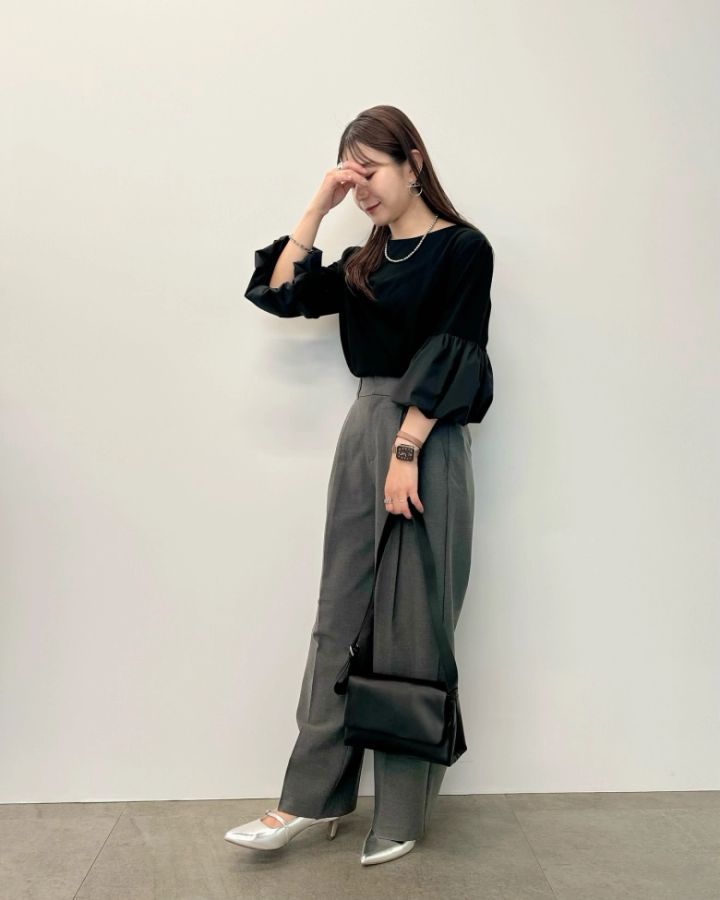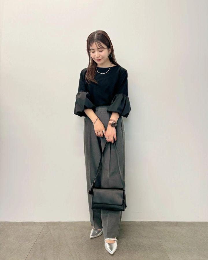 こちらは、@mag__yunさんのコーデ。ブラックやグレーを使った上品さ漂うモノトーンコーデにロングベルトショルダーバッグを合わせれば、オフィスでもしっくりなじむおしゃれコーデの完成!バッグがシンプルなデザインなので、ぽわんとした袖のトップスやタック入りのパンツなどデザイン性のあるアイテムを合わせると、よりおしゃれさが引き立ちます。