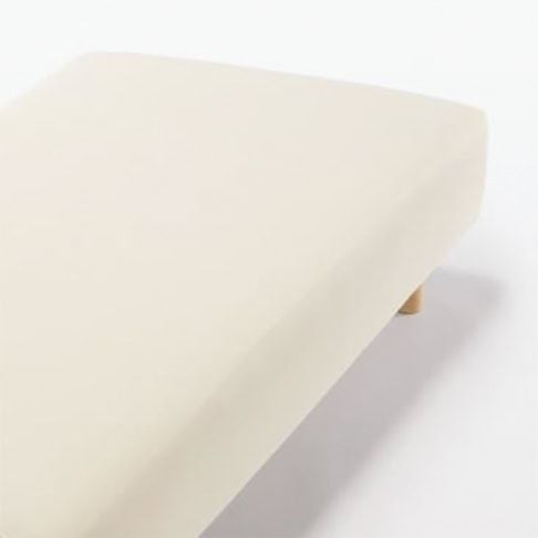 接触冷感性のある素材を使用。伸縮性があり、ベッドメイクしやすい。フィットする ひんやりボックスシーツ・SS-S ¥2,990(無印良品/良品計画)