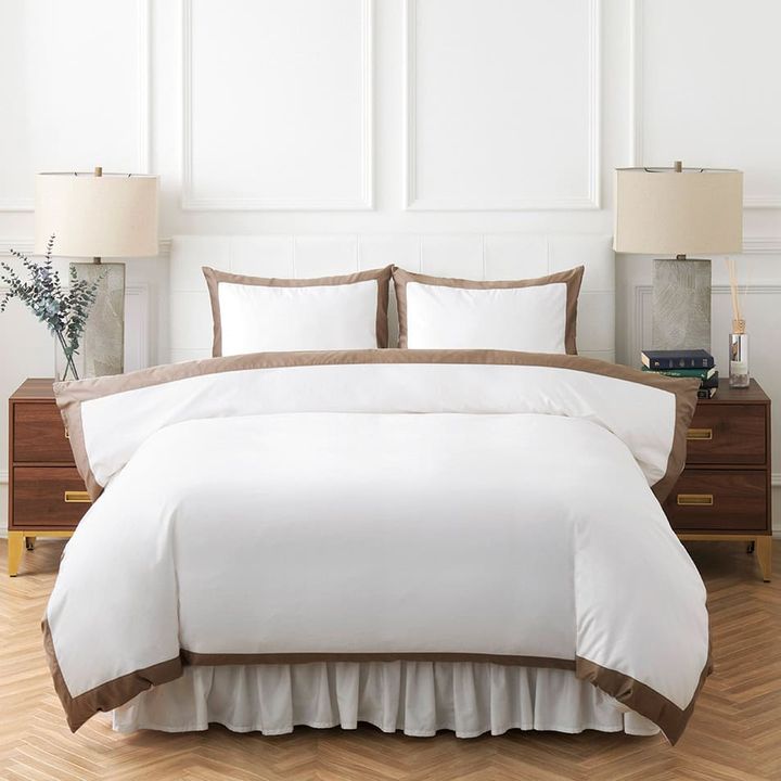高密度に織られた素材はスムースな肌触りが最大の魅力。手足を滑らせるたびに感じるなめらかな質感はやみつきに。500TCビコロール 掛け布団カバーセット モカ〈掛け布団カバー1枚・ピローケース2枚〉ダブルサイズ¥67,100(ホテルライクインテリア)