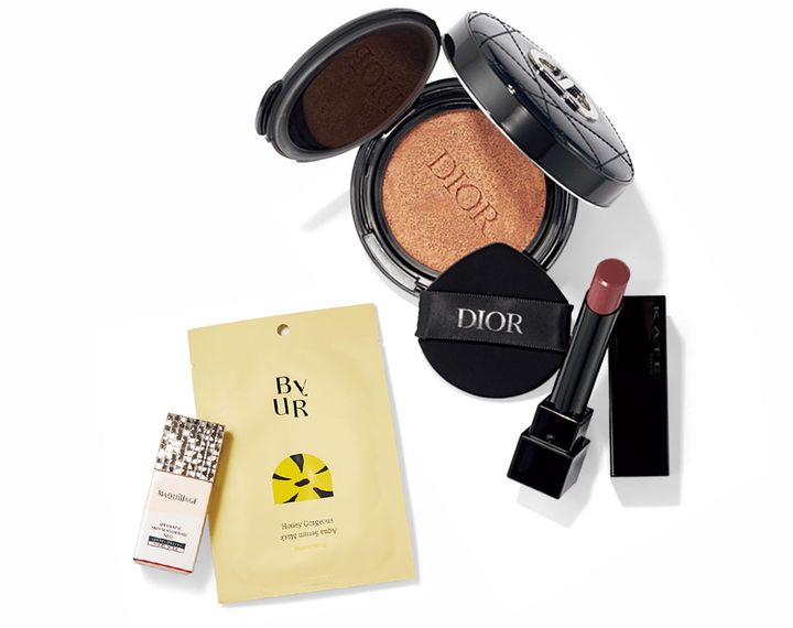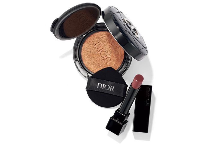 上:色移りしない上質なマット肌に。ディオールスキンフォーエヴァークッション全7色 SPF35・PA+++ ¥9,350 ※セット価格(パルファン・クリスチャン・ディオール)下:女っぽさも出せるローズカラー。KATE リップモンスター 17 ¥1,540〈編集部調べ〉(カネボウ化粧品)