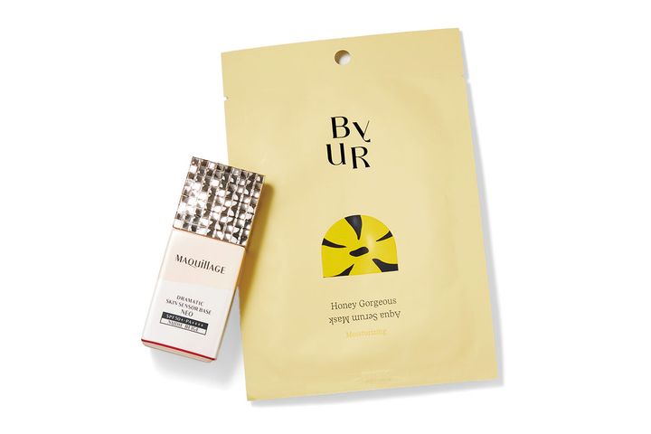 左から:マキアージュドラマティックスキンセンサーベースNEO ヌーディーベージュSPF50+・PA++++ ¥2,970〈編集部調べ〉(資生堂)、乾燥による緩み毛穴を引き締める。プランプハニーアクアセラムマスクv1 1枚¥390(Hamee)つるんとした滑らか肌に。