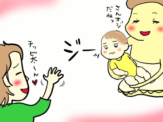 あはは!さん太郎さんと目が合ったチビ太くん、確実にこの時『人見知り』スイッチが作動しましたねー!