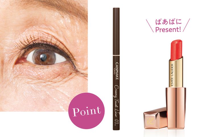 柔らかいペンシルタイプのアイライナーでまつ毛の隙間を埋めるようにアイラインを引いていき、さらにナチュラルに盛れるつけまつ毛をつけて、目元をさりげなく強調させました。