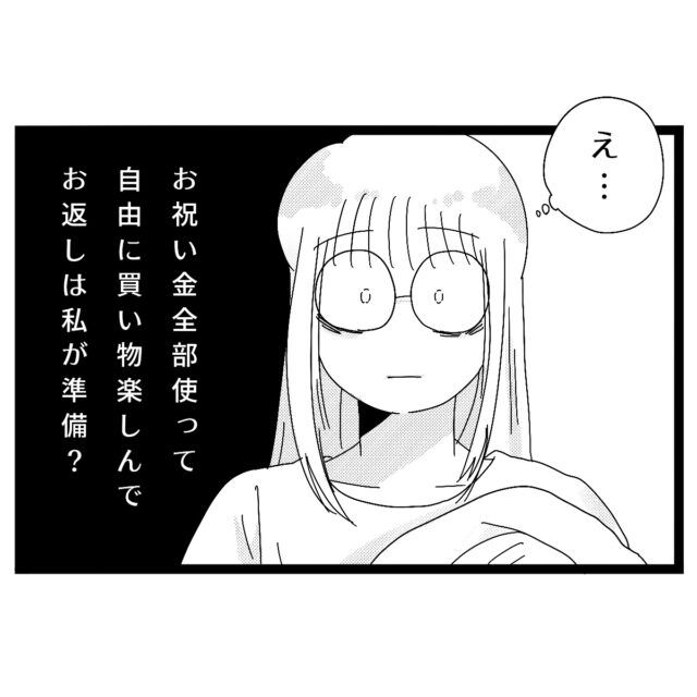 「え・・」と驚くアサ子さん、「そもそも・・お祝い金を全部使って自由に買い物楽しんだにもかかわらずお返しは私が準備する・・だと!?」実母の言葉を聞いたアサ子さんは思わず硬直しました。